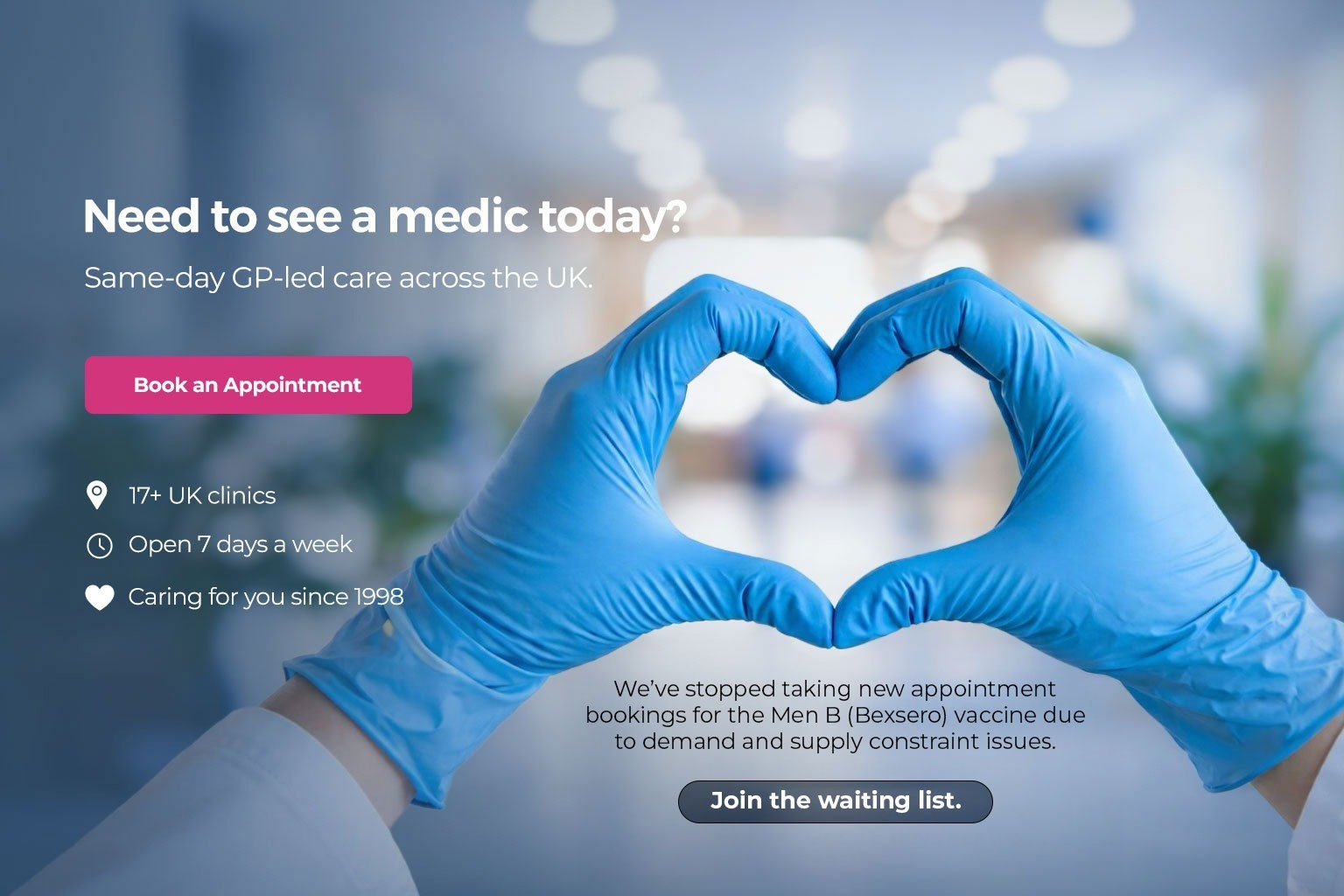 Our medical team of 25 British doctors and clinicians are available now to offer same day personalised care – come and see us, book online or call 03334559070.